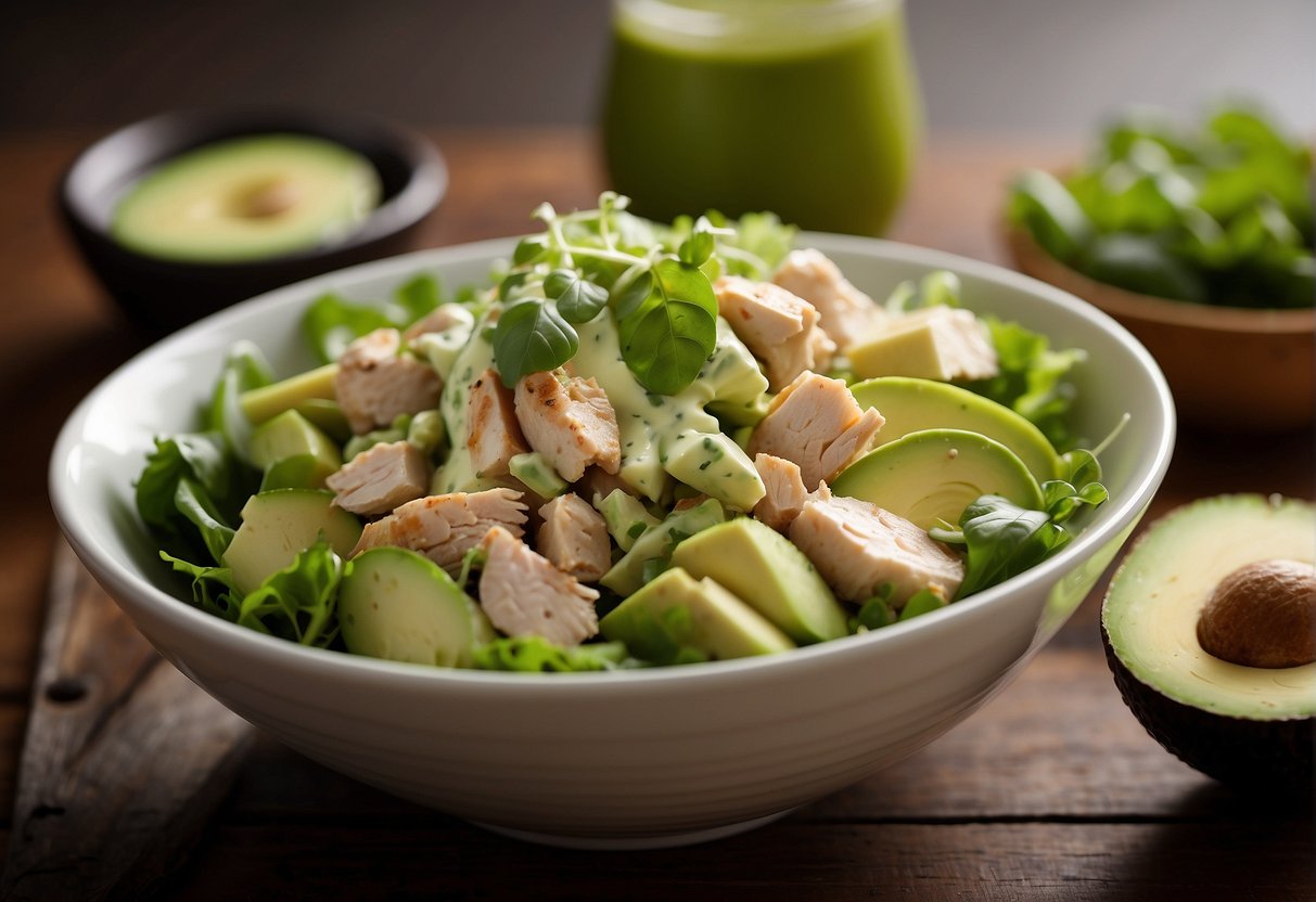 A bowl of avocado chicken salad with chunks of chicken, diced avocado, and mixed greens, drizzled with a creamy dressing