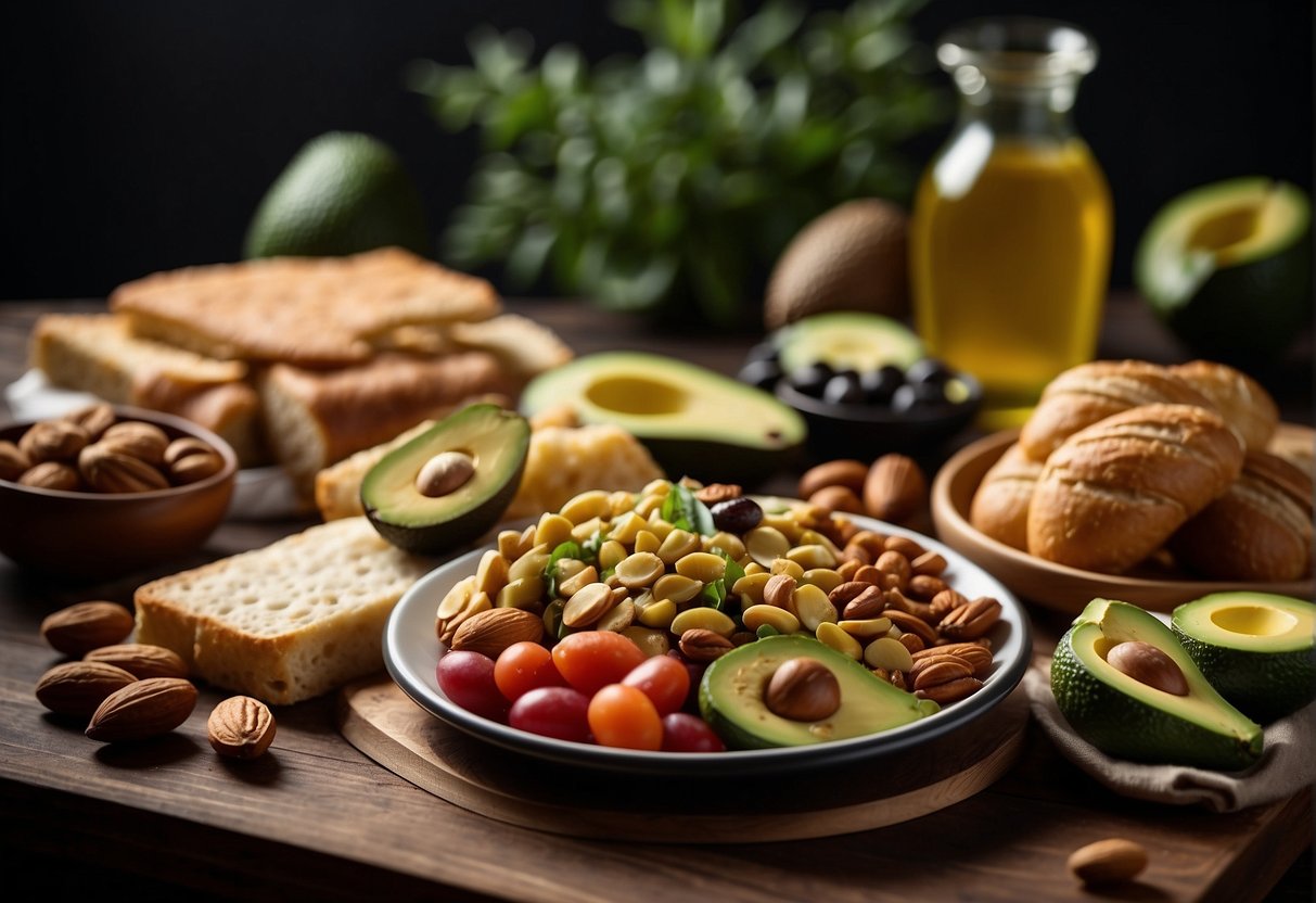 A table with a variety of foods: avocados, nuts, and olive oil on one side, and processed meats, fried foods, and pastries on the other