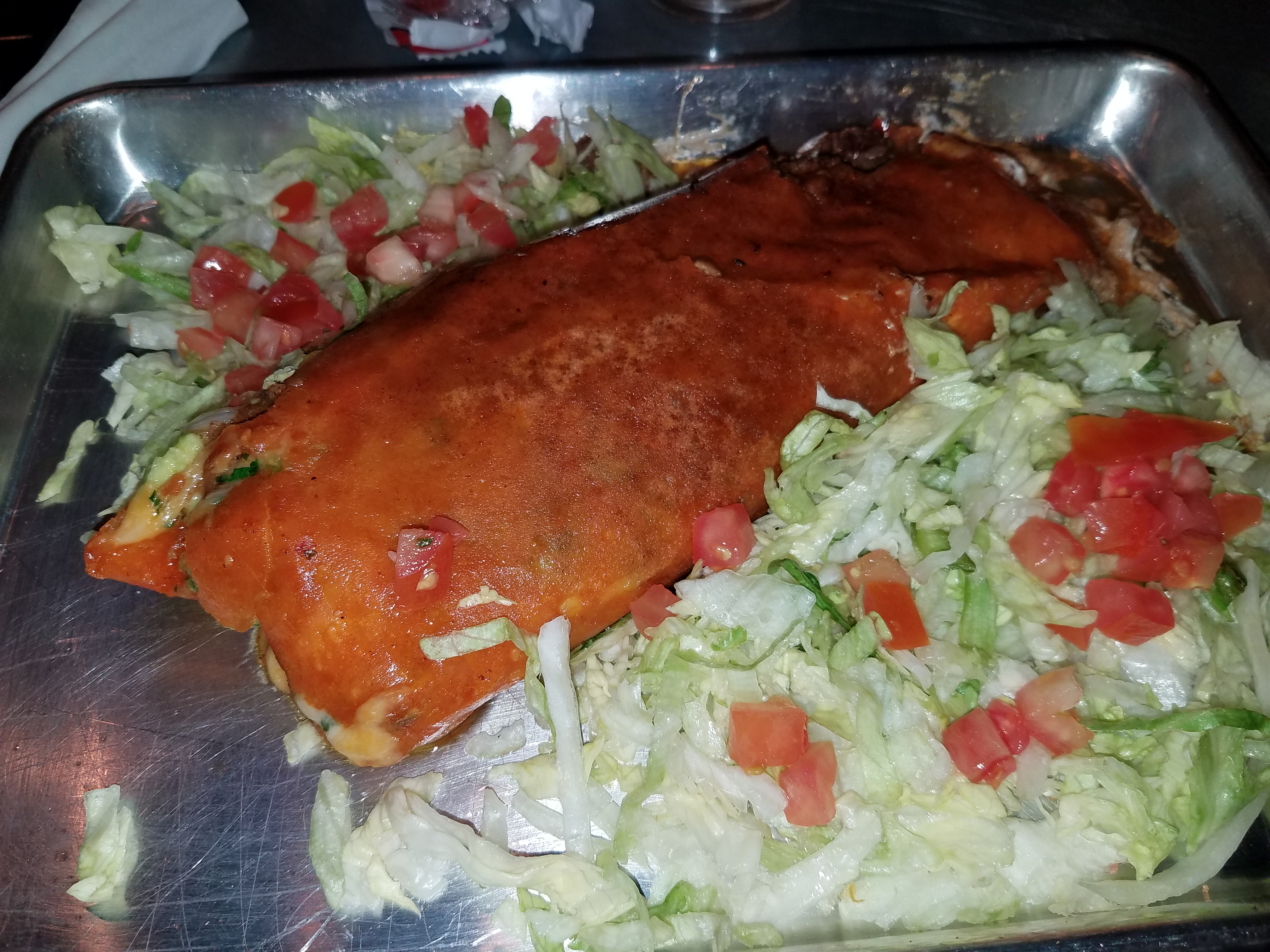 Let’s see if I can describe what was in the burrito. I used different lighting for this next picture to try to show the vivid colors of the plate. I would have taken more time to make a better picture, but let’s be honest. I WAS HUNGRY. Everyone at my table was hungry and they were all waiting for me. This had to happen and it had to happen fast.